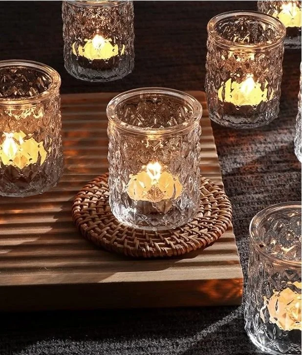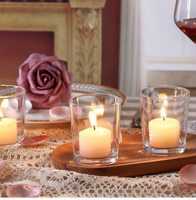 The transparent allure of clear glass creates a versatile and timeless aesthetic, allowing the flickering candlelight to shine through.