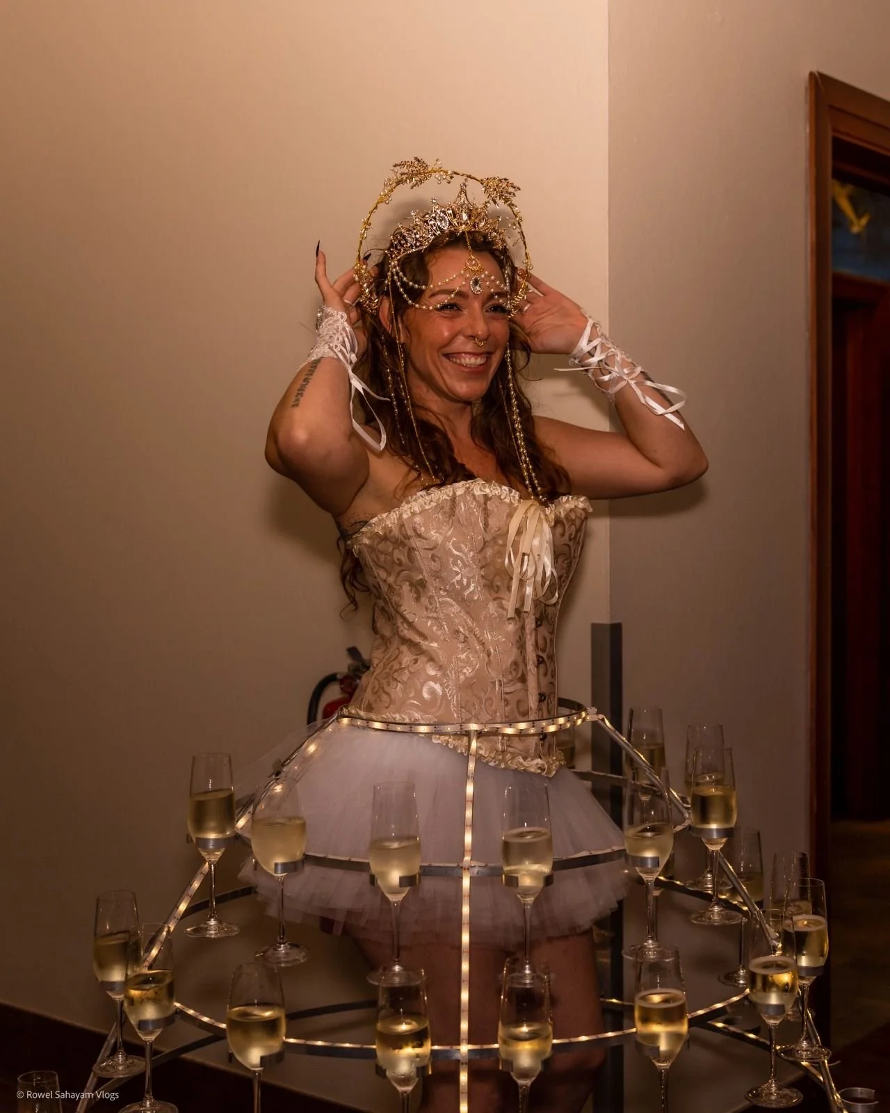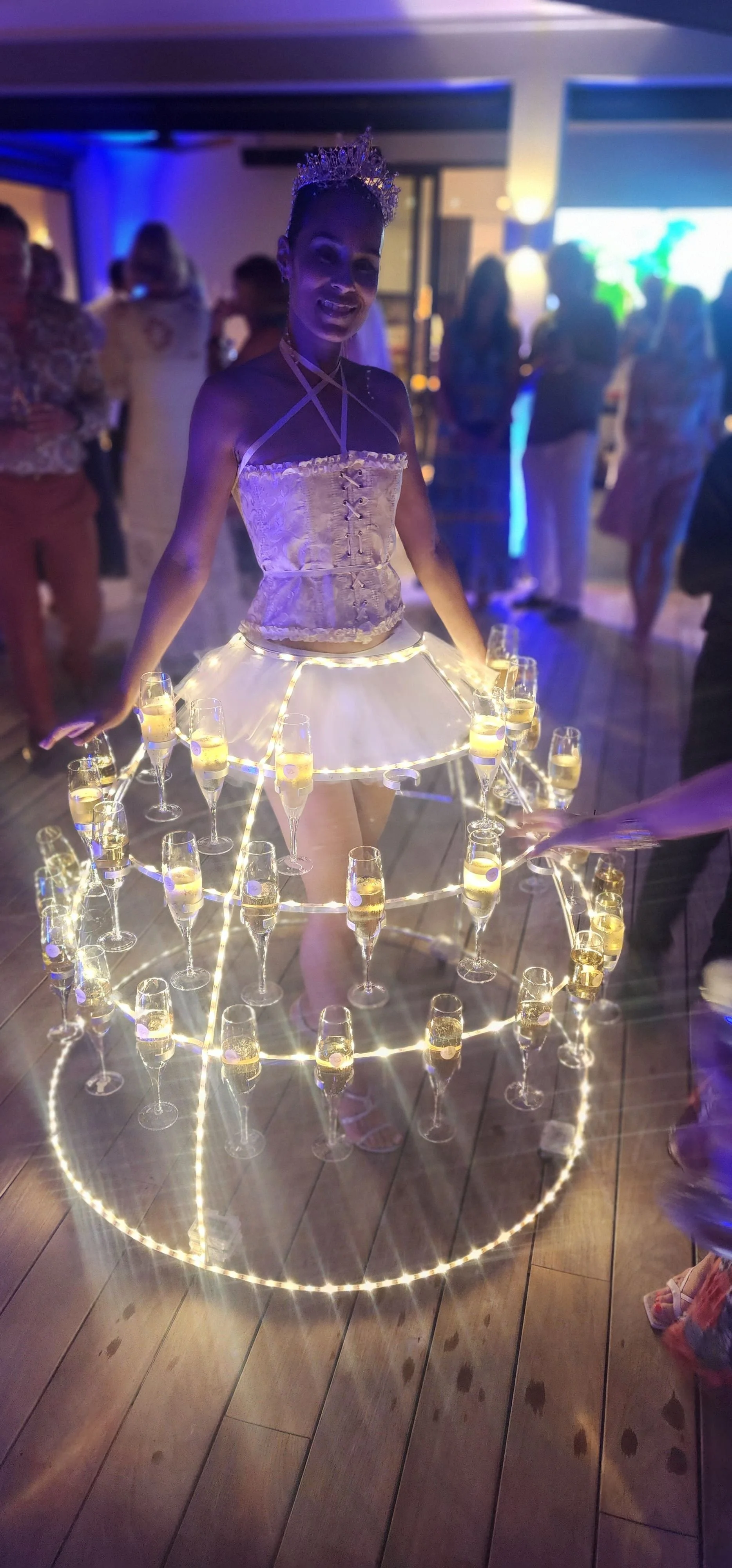 Elegant champagne dress available for rental, perfect for special occasions. This gown features LED lights, ensuring it stands out at any event. Make a statement without the commitment of purchasing – rent the perfect champagne dress for your next memorable occasion.
